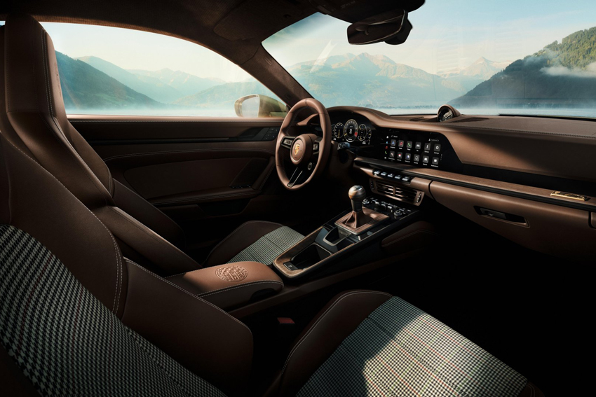 L'intérieur reçoit également des finitions spéciales telles que les bandes centrales des sièges "Grid-Weave F.A." évoquant un tissu à motif de veston entre les bandes latérales en cuir club brun truffe ainsi que des coutures décoratives Beige Calcaire. On retrouve ce tissu dans la boîte à gants ainsi que sur les tapis de sol réversible du coffre à bagages. Le tableau de bord intègre un Chrono Sport dont le design reprend celui de l'original réalisé pour F.A. Porsche. Le levier de vitesse est composé d'un pommeau en bois de noyer stratifié à pores ouverts et d'une plaquette où est gravée la signature du designer. Une autre plaquette dorée, située sur la baguette décorative du tableau de bord, est gravée en fac-similé d'une silhouette d'une 911 et d'une inscription "One of 90". En outre, le coffre de rangement logé dans la console centrale porte la gravure de même design que la plaquette du capot du coffre à bagages.