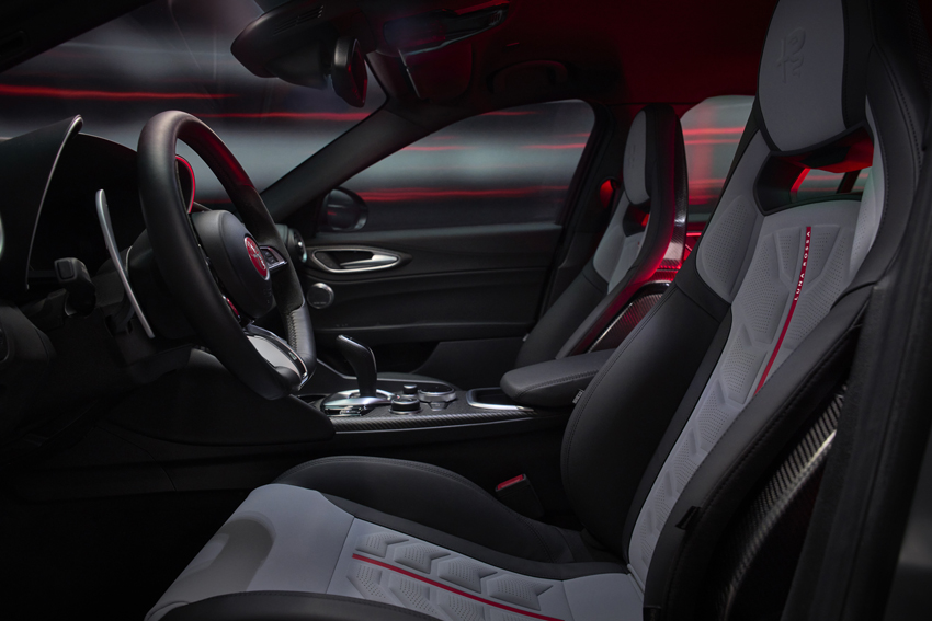 Cette série limitée se distingue également par une esthétique spéciale comprenant une peinture irisée peinte à la main, évoquant des reflets métalliques tels que la coque du voilier Luna Rossa. La livrée bicolore, rehaussée d’une bande latérale rouge et de l’inscription Luna Rossa, renforce son identité. Pour la première fois, les logos Alfa Romeo adoptent un fond rouge, tandis que le carbone apparent sur le toit, le scudetto et les rétroviseurs, permettent de souligner le caractère exclusif du modèle. Les jantes de 19 pouces reçoivent elles aussi des accents rouges, clin d’œil direct à l’univers de la compétition nautique.