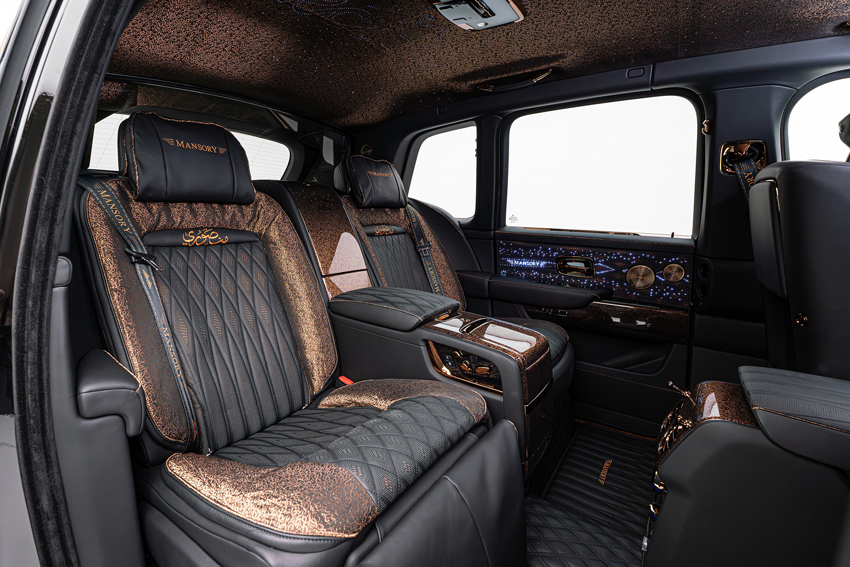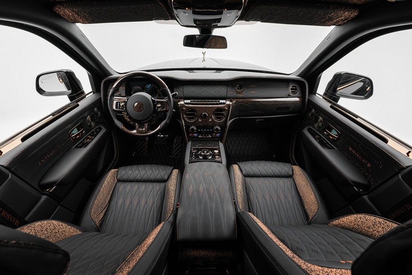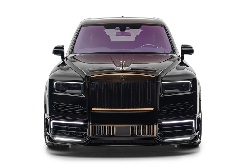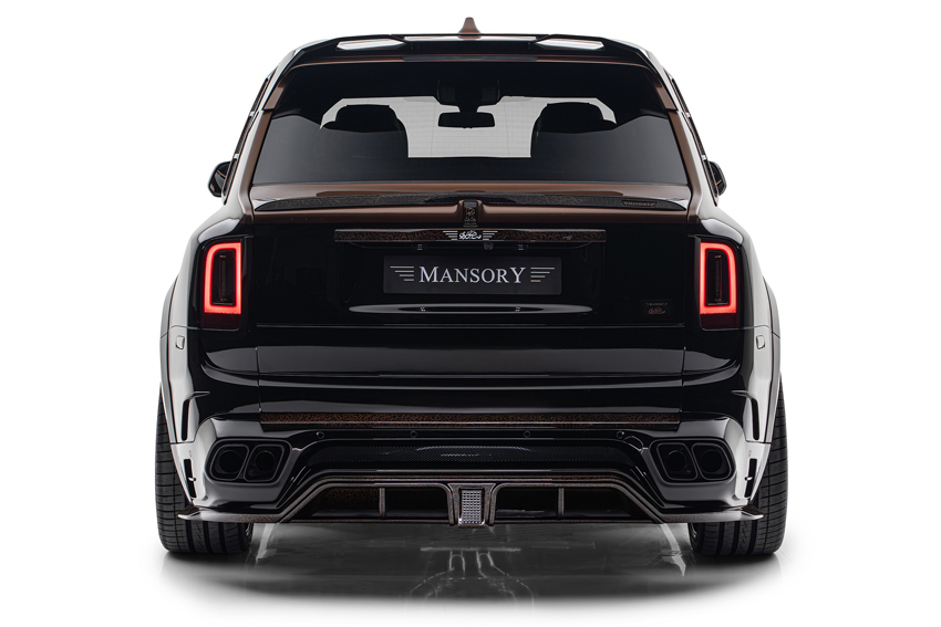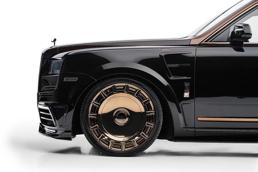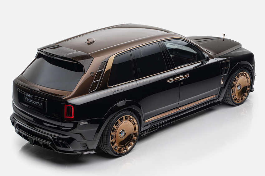 Mansory transforme le SUV Cullinan avec un kit carrosserie large coloré de noir et d'éléments dorés, à l'image de la Bugatto Veyron Linea d'Oro présentée en 2010. Les transformations commencent par la coloration dorée des composants de série chromés et argentés tout comme les jantes dorées de 24 pouces type "FD.15" montées de pneumatiques 295/30R14 hautes performances ainsi que des éléments de carrosserie en fibre de carbone de couleur cuivre tels que sur le capot, les ailettes du bouclier avant, les prises d'air latérales, l'aileron et le diffuseur arrière. Les flancs et l'arrière ont été redessinés nécessitant un remodelage des jupes latérales afin de calmer le flux d'air.