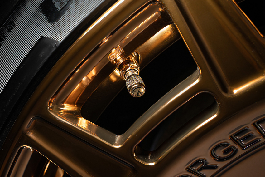 Les pièces en carbone à l'intérieur sont décorées d'incrustations en or véritable. Tous les autres éléments d'origine en chrome ou en argent sont peintes en or de sorte que seules les couleurs noires et or apparaissent à l'intérieur. De véritables incrustations en or sont également utilisées sur la console centrale et les pédales. Les sièges en cuir ainsi que les tapis de sol bénéficient également d'un contraste de couleur grâce aux surpiqûres.